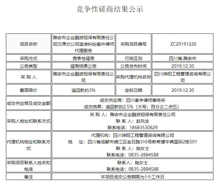 雅安市企業(yè)融資擔保有限責任公司漢源分公司追償糾紛案件律師代理服務(wù)競爭性磋商結(jié)果公示